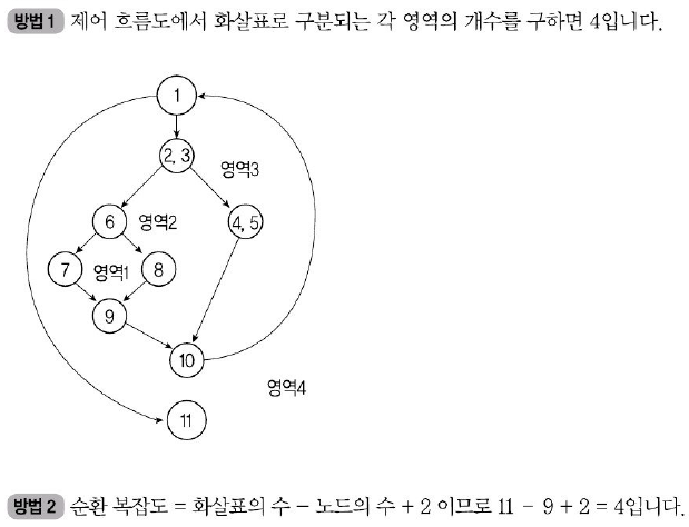 - 제어 흐름도(G)에서 순환 복잡도 V(G) = E - N + 2 (E: 화살표 수, N: 노드 수)