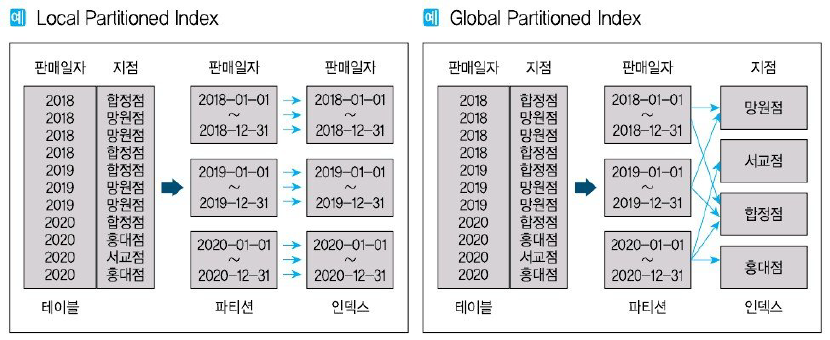 - Global Partitioned index: 파티션은 '판매일자' 필드를 기준으로 수행하고, 인덱스는 '지점' 필드를 기준으로 수행