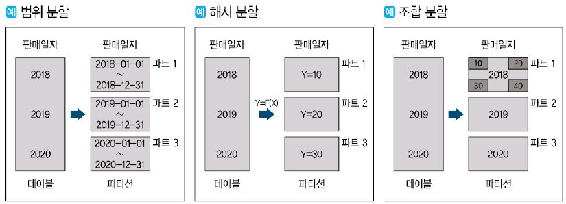 - 조합 분할: '판매일자' 필드를 기준으로 연도별로 파티션을 나눈 다음 하나의 파티션 안에서 다시 해시 함수를 적용하여 다시 파티션을 나눔.