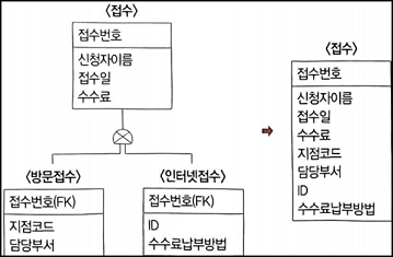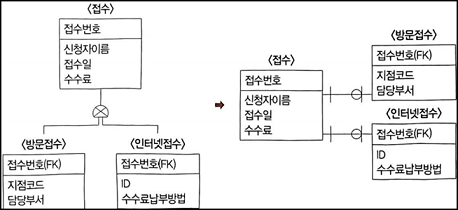 💡 서브타입의 <방문접수> 개체에 있는 '지점코드', '담당부서'와 <인터넷접수> 개체에 있는 'ID', '수수료납부방법'이 슈퍼타입인 <접수>개체에 통합되어 <접수> 테이블로 변환