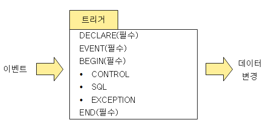 - 데이터베이스 시스템에서 데이터의 삽입, 갱신, 삭제 등의 이벤트가 발생할 때마다 관련 작업이 자동으로 수행되는 절차형 SQL