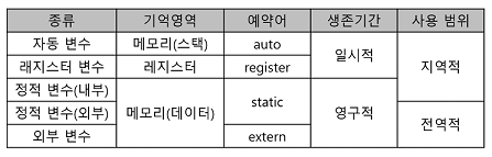 - 변수가 할당되는 기억영역에 따라 사용 범위 제한