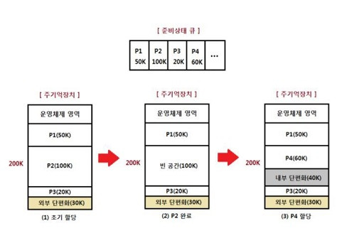 - 외부 단편화 : 분할됭 영역이 할당될 프로그램 크기보다 작아서 할당될 수 없어 사용되지 않고 빈 공간으로 남아있는 분할된 전체 영역