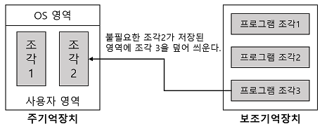 - 프로그램을 실행하려면 프로그램 전체가 주기억장치에 위치해야함