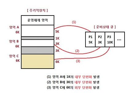 - 내부 단편화 : 분할된 영역이 할당될 프로그램 크기보다 커서 할당된 후 사용되지 않고 남아 있는 빈 공간