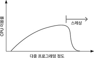 - 다중 프로그래밍의 정도가 높아짐에 따라 CPU의 이용률은 어느 특정 시점까지는 높아지지만, 다중 프로그래밍의 정도가 더욱 커지면 스래싱이 나타나고, CPU의 이용률을 급격히 감소