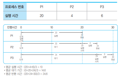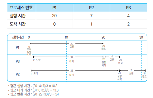 - 준비상태 큐에서 기다리고 있는 프로세스들 중에서 실행 시간이 가장 짧은 프로세스에게 먼저 CPU를 할당