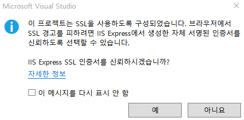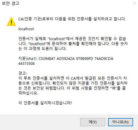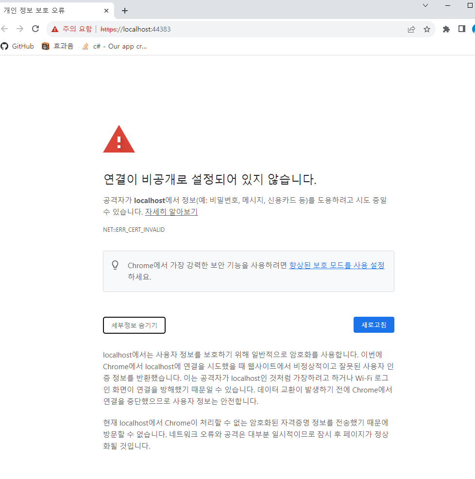 - mmc์์ ๋ก์ปฌ ์ปดํจํฐ → ๊ฐ์ธ์ฉ → ์ธ์ฆ์(localhost)๋ฅผ ์ญ์ ํ๋๋ VS์์ ํฌ๋กฌ์ด ์คํ์ด ๋์ง ์์๋ค.