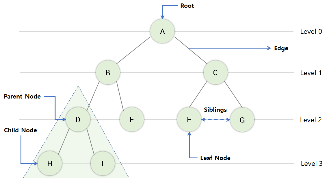 - 자식 노드(Son Node) : 다음 레벨의 노드 (H, I의 부모 노드=D)