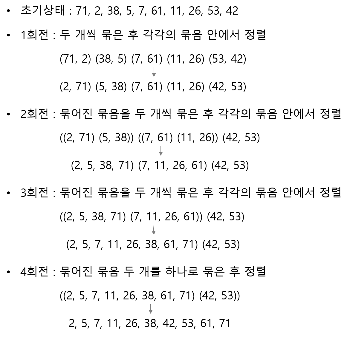 - 이미 정렬되어 있는 두 개의 파일을 한 개의 파일로 합병하는 정렬 방식
