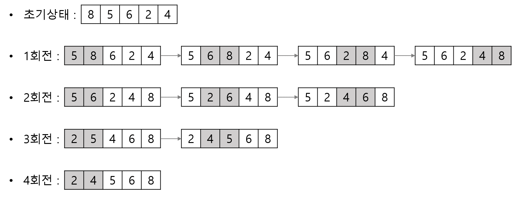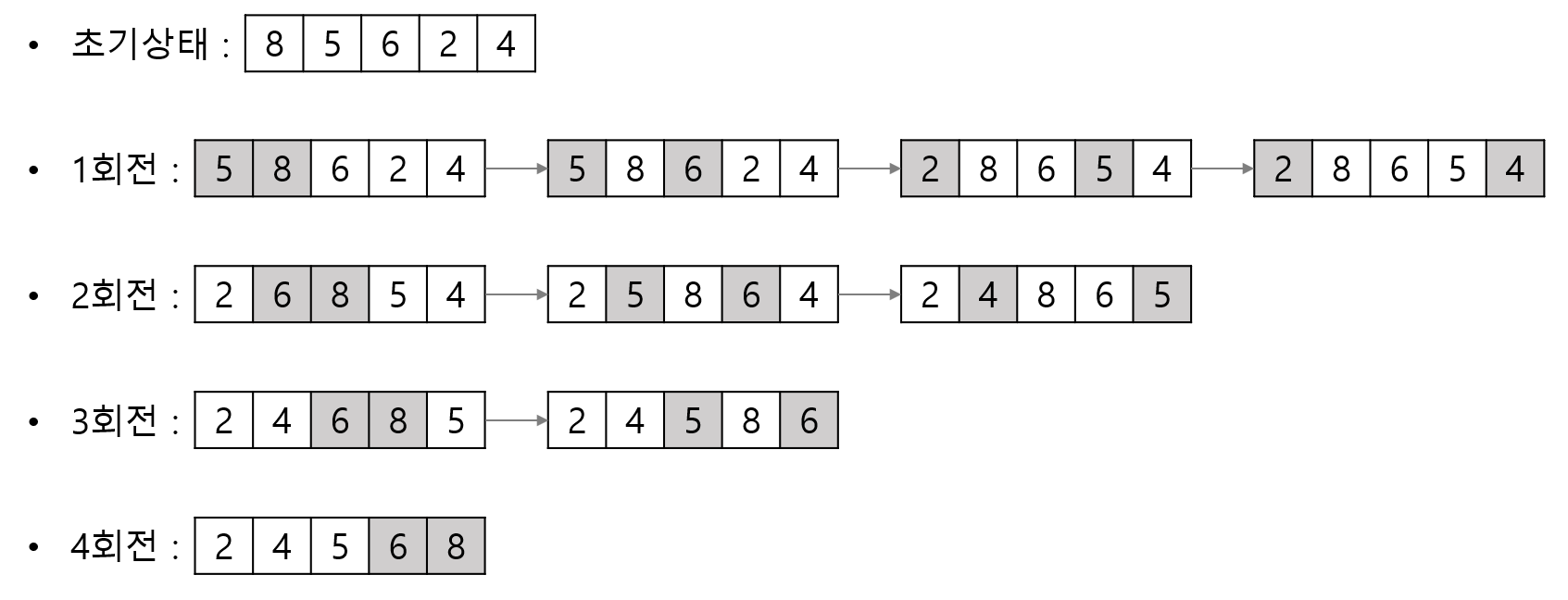 - 인접한 두 개의 레코드 키 값을 비교해 그 크기에 따라 레코드 위치를 서로 교환하는 정렬방식