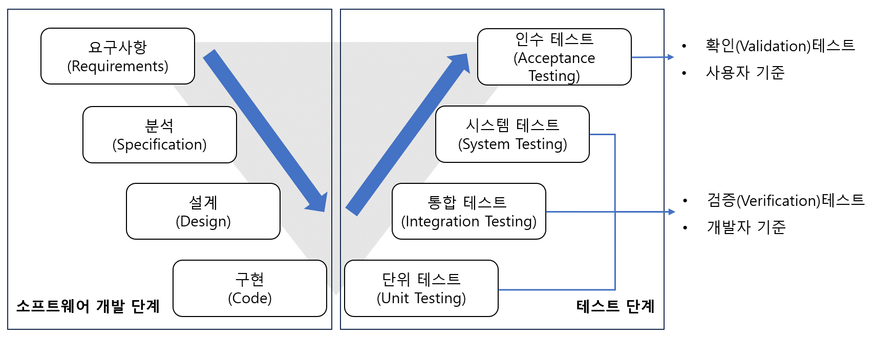 - 시스템 테스트 : 설계된 소프트웨어가 시스템에서 정상적으로 수행되는지 확인