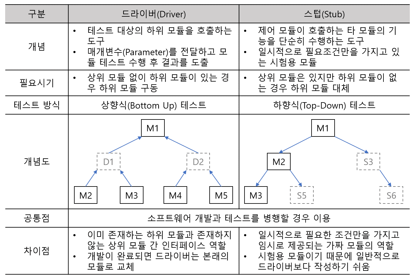 - 주요 제어 모듈은 작성된 프로그램을 사용하며, 주요 제어 모듈의 종속 모듈들은 스텁(Stub)으로 대체