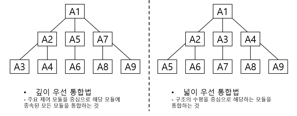 - 깊이 우선 또는 넓이 우선 등 통합 방식에 따라 하위 모듈인 스텁들이 한 번에 하나씩 실제 모듈로 교체됨